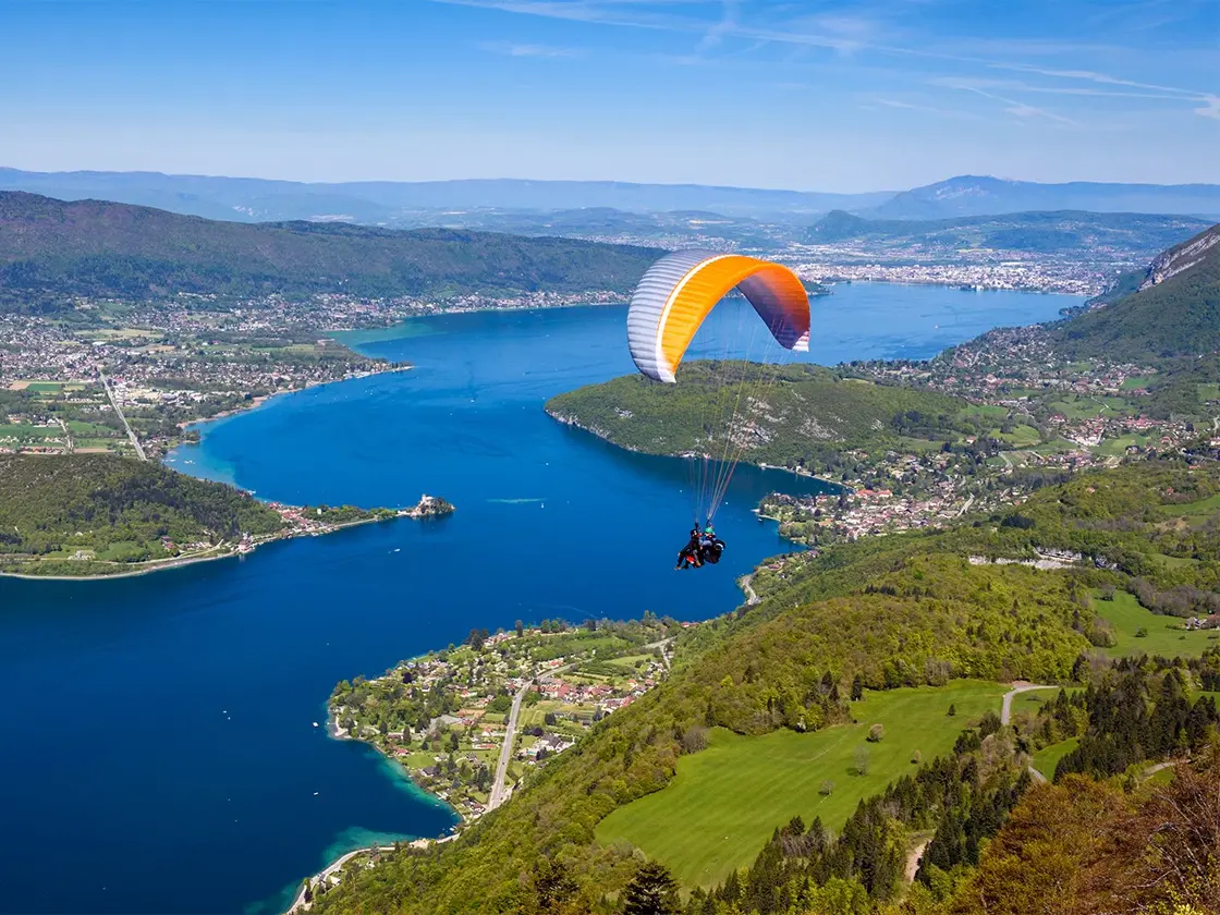 Annecy — Col de la Forclaz. The signature flight. You launch from 1,240 m and soar over Lac d’Annecy with La Tournette and the Dents de Lanfon rising around you. Flights range from 10-minute discovery runs (from ~€80) to 30–45 minute thermal flights (€120–€150) where your pilot climbs to cloudbase and you see the entire lake basin from above. Multiple schools operate from the col — Grands Espaces, K2 Parapente, Flyeo, and Annecy Aventure are all well established.